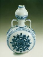 器作扁体葫芦形,颈、肩间饰扁圆体双系,下有椭圆形圈足,底部有釉。上部圆体葫芦口下颈腹间绘青花缠枝花纹一周,下部扁腹两面绘轮花纹,周围饰几何纹一圈,双系下绘缠枝花纹。