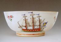 碗撇口,口下渐收,圈足。碗口内侧和碗足用浅红彩画几何形装饰,碗外壁画有两只18世纪的帆船以及船上人物,船上挂有瑞典旗帜,两边配有花束。