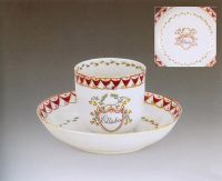 杯子的主体图案为盾牌,上写有名字“ELLSBO”(伊来斯波),并绘有小黄花和绿叶围绕的纹饰。杯子的内部和托碟内口沿绘有金色和绿色攀缘植物。这套瓷器由靠近哥德堡的荷兰岛上伊来斯波庄园主订制。