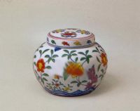 罐直口,短颈,扁圆腹,腹下略收,内圈足。通体绘山石花卉,以红、黄、绿、赭、青花等色绘折枝花六朵,数只彩蝶飞于花间,盖直口,平顶,盖面以红、黄彩绘四朵灵芝。