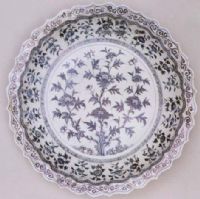 盘通体为莲花瓣式。青花纹饰,盘心饰山石牡丹,里壁饰折枝花纹和回纹,口沿饰忍冬纹,外壁饰折枝花纹。此器中心纹饰以牡丹象征“春”,以山石象征“寿”,描绘自然流畅,与严谨的布局相得益彰。