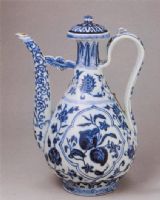 壶撇口,细颈,垂腹,圈足。长曲柄,柄上有小系,流与颈间有云形板连接。盖拱顶,圆系钮,与柄系相对应。通体青花纹饰,颈饰蕉叶纹,下饰缠枝莲纹,腹两面饰菱形开光,一面内绘折枝桃纹,一面内绘枇杷果纹,间隔处饰缠枝花卉纹。