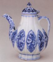 壶似梨形,通体呈十瓣瓜棱状,圈足。弧形柄,柄上端有小圆系与盖边小圆系对应。盖拱顶,宝珠钮。青花纹饰,腹部饰菱形开光,内绘云龙纹。流饰缠枝纹,柄饰忍冬纹,盖饰莲瓣纹。