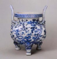 炉洗口,短颈,腹长方多角形,口肩处有朝天耳,下承以三兽足。青花纹饰,口饰锦纹,腹两面饰松竹梅纹,双耳里侧饰折枝灵芝纹,外侧饰忍冬纹,三足上部各饰兽头,兽张口衔足。