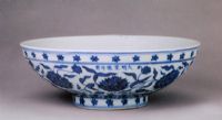 碗敞口,方唇,浅腹。里白釉。外青花纹饰,口沿下及足墙饰朵梅纹,壁饰缠枝莲纹,近足处饰莲瓣纹。外口沿下青花横书“大明宣德年制”六字楷书款。