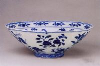 碗敞口,口呈葵瓣形,斜腹。通体青花纹饰,碗心饰折枝桃纹,里口及壁饰折枝花纹,外壁上饰折枝果纹六枝,下饰折枝花纹六枝。