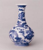 瓶撇口,长颈,圆腹,圈足。青花纹饰,口沿绘如意云头纹,颈、腹绘三云龙戏珠,近足处绘海水,足墙绘回纹。
