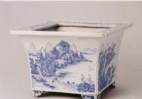 盆呈长方形,折沿口,委角,深壁,平底下承四如意形足,底有圆孔,青花纹饰,折沿上绘松、竹、腹四面分别绘山水人物图,内含有“一帆风顺”、“指日高升”等吉祥画意。