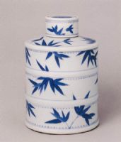罐竹节形,小直口,折肩,筒腹凸起弦纹,圈足。盖平顶。
