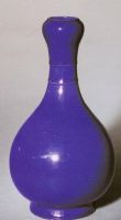 瓶口呈蒜头形,溜肩,圆腹,圈足外撇,通体施茄皮紫釉,釉面匀净,足内施酱釉,无