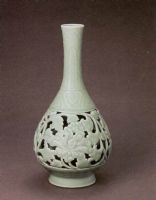 套瓶为小瓶外套大瓶,外瓶上口微撇,颈细长,腹下垂丰满,为“玉壶春瓶”式。通体及足内均施青釉。颈部印蕉叶纹及仰覆如意头云纹,腹部为镂空缠枝牡丹纹。