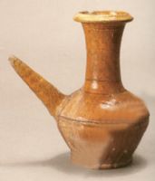 盘口外翻,长颈,鼓腹扁圆,饼形底,腹一侧附管状长流,器腹巧妙地在胎接处饰以凸弦纹。