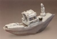 船首尾窄,中部宽,底平。船体中空,有中舱和艄舱,中舱两侧有横栅栏。通体施青白釉。制作精緻。此类瓷制小船为元代典型器。另有青花及龙泉窑青釉制品。或认为是砚滴,属文房用品。
