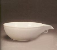 平唇,口沿和底部露胎,方槽形短流,流下部有一卷云形小系。匜内底饰弦纹一周。 此器造型优美,胎薄而坚,釉色青白莹润,为此类器物中的精品。