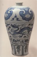 梅瓶造型端庄秀丽,折沿、口沿平,颈短而细,肩上部甚平。口缘部殘缺两处。釉色滋润,纹饰淡雅,通体以进口青料绘画双龙经济计划云纹,肩部饰如意云肩纹,底部不绝釉。