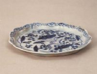 盘口沿外折,为八瓣菱花式,平砂底。盘内底主体纹饰是两束莲花和一些水草纹,口沿部绘一周卷草纹。整个花纹简朴