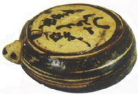 盒蓋呈扁圆形,造型特殊,邊置龜頭繫中空能穿繩。用白地褐彩装饰,蓋面朝光內繪簡筆月影梅纹,蓋内正中用褐彩繪“兆兆"紋,近似雙蝶,此褐彩技法為元代吉州窰常見。