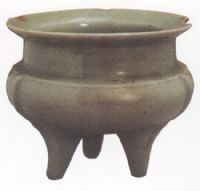 敞口,折沿,束頸,扁鼓腹,三錐形足。此爐為南宋龍泉窰的典型作品,口沿有傷殘。