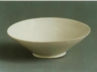 此件器物敝口,浅腹,折腰,圈足.通体施白釉,胎白细腻.釉中开细裂纹,器外壁釉一半剥釉.