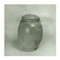 器身呈瓜棱状,子母口,溜肩,圈足.肩部置二对称泥条形系,器盖面微鼓,中间作小平面,边沿有二小孔,为穿绳系钮之用.