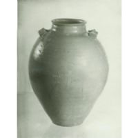 口沿外翻,短直颈,圆肩,鼓腹,下腹斜收,平底内凹,肩部横置宽边环耳一对,一耳下方釉下刻官字,制作粗糙,底部露胎.