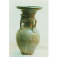 浅盘口,口沿外侈,细长颈,溜肩,下腹敛收,平底,颈内有凸棱一周,釉不及底.颈肩部对称四条形鋬,塑一腾空蟠龙,龙作回首状,三爪,龙身划鳞,鳍,极其生动.
