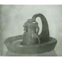 灯盘圆形,口外撇至口沿又向内敛,底盘正中有一牛型油管,顶上和末端后壁均有方孔,可插灯芯。后面有弯曲把手,象征牛尾。牛的四肢上下并列,嘴及双眼略施褐色点彩,釉色青黄,开冰裂纹。