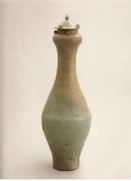 瓶平口短颈,圈足带盖。盖呈笠帽状,宝珠形钮,边缘设三圆管状小系。器腹上部强长束腰,下部呈腰鼓状。颈部设三圆管状小缶。通体施青白釉,呈色泛青;圈足素胎。