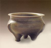 平沿,束颈,鼓腹,下腹弧收,鬲式三足,腹部至足底各有一条突稜,内底有三个旋涡状凹槽。三足底无釉,呈黑褐色,其余部位施青釉,开片。