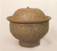 盖作圆弧形,沿微上翘,盖面饰三重覆莲,每重八瓣,顶以莲蒂作钮。罐直口、孤腹、平底内凹。
