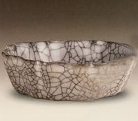 口为八瓣花形,壁斜收,亦做出凹凸稜线。平底,有六个支钉痕,断面可见铁黑色胎骨。通体青灰釉,开黑色网状纹。葵花洗,花口洗的一种,形状通常为五至十个花瓣形,传世品中宋代汝、哥、官等窑均有烧造。
