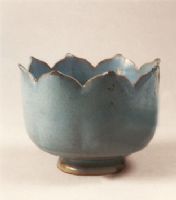 口呈八曲莲花式,花瓣尖外撇,深腹,圈足外撇。灰瓷胎。里外满施天青釉,釉面有棕眼,足露胎。器内底有一圈刮釉露胎[俗称澀圈],此器釉色纯正润泽,实属珍品。