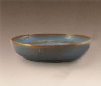 此盘敛口圆唇,斜壁浅腹,内平底,矮圈足。通体施天蓝釉,釉面光亮莹润,器表有冰裂纹开片。