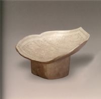 枕面做成云头形,边缘翘起,以适合头的形状;枕面有六层刻花装饰,以弦纹相隔,手法粗犷;枕底无釉,有一孔。