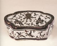 此枕为如意头式,枕面白地上绘有黑彩折枝牡丹花,花瓣、筋叶内加饰有细腻有务的刻划线纹,具有白描勾勒一般的艺术效果。