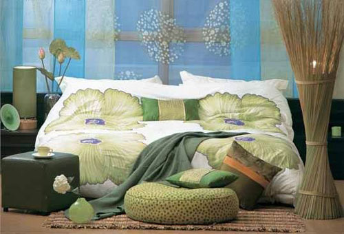 纯白色的床单当然会显得有些冷清,可是大肆开放的淡绿色的花朵是不是又立即将春天的生机释放出来了呢?加上深绿浅绿两种条纹搭配的靠垫,以及绿色的床榻,绿色斑点的床尾坐垫都将清新的颜色韵味舒展着,令人眼前一片旖旎。
