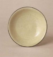撇口,小折沿,浅圈足。盘内刻莲瓣纹,线条流畅。通体白釉稍泛黄色,有涙痕。由於定窑采用覆烧工艺,器口无釉,为不光滑的芒口,故镶包银口。