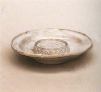 六曲花式盘口,折沿,浅腹,盘心突起圆托,双圈足。白瓷胎,上白色化妆土,施白色透明釉。托及胫均雕复瓣莲纹,纹饰别致,釉面结拜素雅。盏托亦称[茶船],为承托茶盏、以防烫手的用具。始于唐,流行于五代之后。