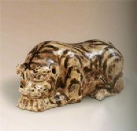 整体造型呈趴状的猛虎,丰肩硕臀,腰部背脊平缓微凹,虎头俯贴于前爪之上,后爪蜷于腹下,虎尾紧紧收拢,双耳直立,耳孔前倾,眉骨隆起,张目合唇,眼点定在双目内侧,窥视前方,粗红缸胎,胎质坚硬,挂白色化妆土,满绘铁彩虎斑纹,施微微泛青色的白釉。
