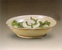 敞口,展沿,斜直壁,浅腹,平底,假圈足。红色陶胎,上白色化妆土,施牙白色低温铅釉,施釉不至底,釉面有开片,内底有三个支烧痕。内底采用对称的表现手法划花卉一株,并填以绿彩。