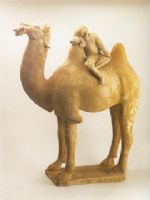 侍女小憩骑驼俑出土于唐墓,陶质红色,原施粉彩,年久脱落。驼做站立状,一女俑盘一足侧坐于驼背上,左臂垂放于左膝上,石臂搭在前驼峰上,头伏于右臂做睡姿。女俑身着圆领右袵长袍,下着裤,足蹬长靴,髮辫左右分梳,自两侧遮耳下垂,给人们展示了一幅丝路漫漫,人困驼乏的生动景象。