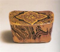 长方腰圆形体,直身平底,枕面微内凹。胎面贴塑黄、褐两色纹样,这种工艺名为绞胎,係以黄、褐两种胎泥绞合在一起,形成花纹,绞胎工艺始于唐代河南地区,盛于宋。