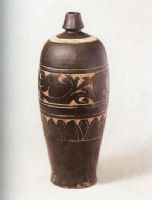 瓶小口,短颈,溜肩,长腹,足微外撇,内凹式圈足。通体施黑釉。肩部刮釉一圈,腹部有剔花纹饰两层;上层为缠枝花纹,下层为莲瓣纹,纹饰间以弦纹相隔,纹饰风格粗犷。此瓶从口的特征及釉色、支烧方法、纹饰等几方面看,应为山西地区瓷窑产品。