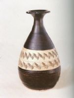 瓶撇口,细颈,长圆腹,浅足。施酱釉,腹部露胎,在胎上划刻两组水波纹,装饰风格独特。