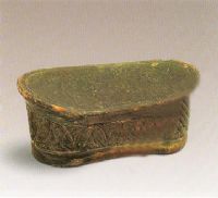 枕面为腰圆形,采用雕划花工艺,枕面铭文用笔流畅生动,枕面外幫四周重饰边圈线,并刻划出简洁向上的草叶纹,绿釉则先素烧胚胎,然后上绿釉烘烤,为两次烧成。