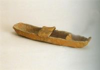 船为黄色泥质陶制,平面近似椭圆形,船头加有长3.5厘米,宽1.5厘米船头防浪板一块。