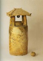 青瓷水井,为筒式,短颈、竖口,窄平肩,肩端有四柱,承顶一个五脊垂檐四面坡的瓦盖。瓦盖内正中有一滑车状的附件,中有孔,供提水穿孔绳索之用。