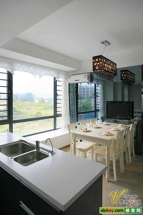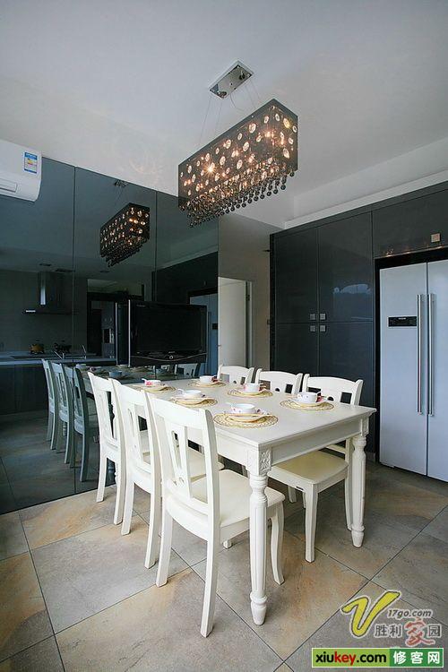 首先,在空间处理上打破常规,令厨房、餐厅、客厅三者之间形成了一个有趣的空间关系,让纯净的世界不显单调。具体做法是把原来餐厅的位置和靠厨房这边卧室 的位置做了对调,餐厅从客厅中独立开来并与厨房构成一个大的空间,这也正好是符合中国人的习惯,同时又利用原有承重墙充当了与客厅之间的屏障作用,使得客 厅也有了其完整性。餐厅厨房以清雅的冷灰色调为主,以简、意、雅的感受渗透整个空间的每个细节中,整体造型上采用非常简洁的直线条勾画,背景墙面特意设计 成镜面,打破了原本整块墙面的沉闷,使整个空间显得灵动时尚。