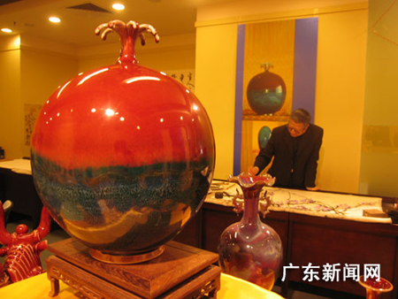 这次主题为“国礼钧瓷走进广州”的钧瓷与岭南书画联展,展示的钧瓷珍品有茄皮紫、玫瑰紫、鸡血红等多种窑变色彩,宛如蔚蓝色的天空出现一片彩霞,五彩渗化,相映交辉;釉中的流纹更是形如流云,变化莫测,意境无穷。