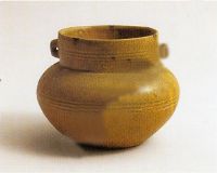 直口高颈,溜肩鼓腹,平底。口沿上有等距三点褐彩。颈上有两道弦纹和两个对称的竖系。腹上也饰有弦纹,釉色青黄。这种形制的器物较为少见,特别是双系的安装形式使造型达到均衡,更显稳重大方。
